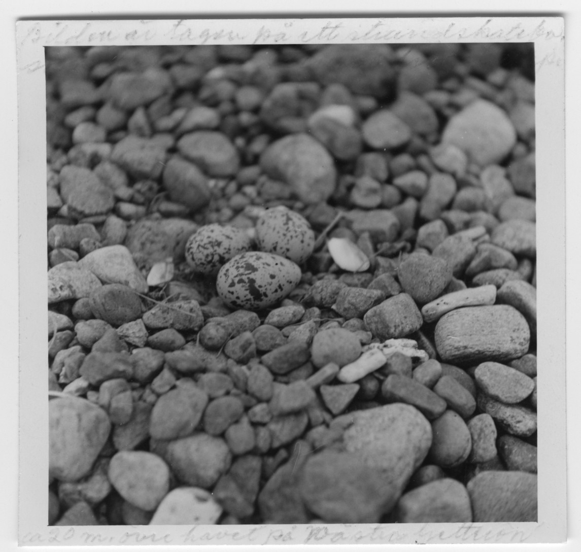 'Bo med 3 st ägg av strandskata liggande på större sten. :: :: Text på fotot: ''Bilden är tagen på ett strandskatebo som låg i ett stenrös högst uppe ca 20 meter över havet.'' :: :: Ingår i serie med fotonr. 4545:1-34.'