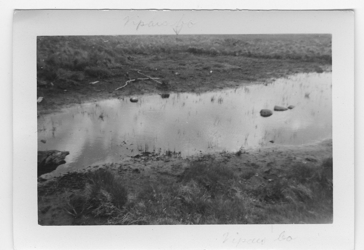 'Vy med göl på en äng med vipbon (högra nedre hörnet samt ovan gölen i mitten av fotot). :: :: Text på baksidan av fotot: ''En 2 meter bred och 10 meter lång göl på en äng vid järnvägen på Billdal. Pilarna visar var de 2 viporna hade sina bon med 4 ägg.'' :: :: Ingår i serie med fotonr. 4544:1-35.'