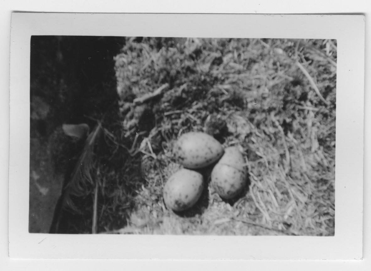 'Bo med 3 havstrutägg. :: :: Text på baksidan av fotot: ''Bo med 3 fullruvade ägg av havstruten vid en stor sten. Kolonin betod av ett 10-tal par på Äggholmen.'' :: :: Ingår i serie med fotonr. 4544:1-35.'