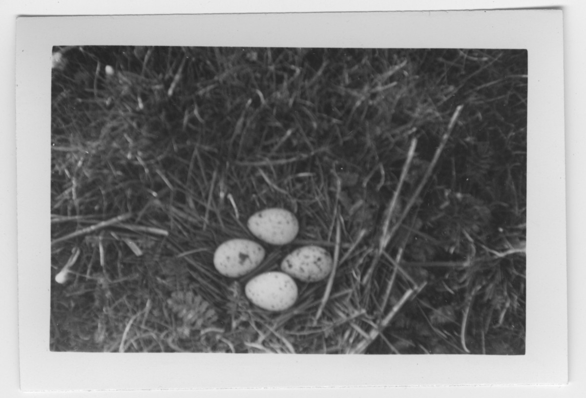 'Bo med 4 ägg av skärfläcka. :: :: Text på baksidan av fotot: ''Skärfläckans bo med 4 st fullruvade ägg på gräsholmen vid Getterön. Äggens storlek var 47 mm i längd och 33 mm i bredd.'' :: :: Ingår i serie med fotonr. 4544:1-35.'