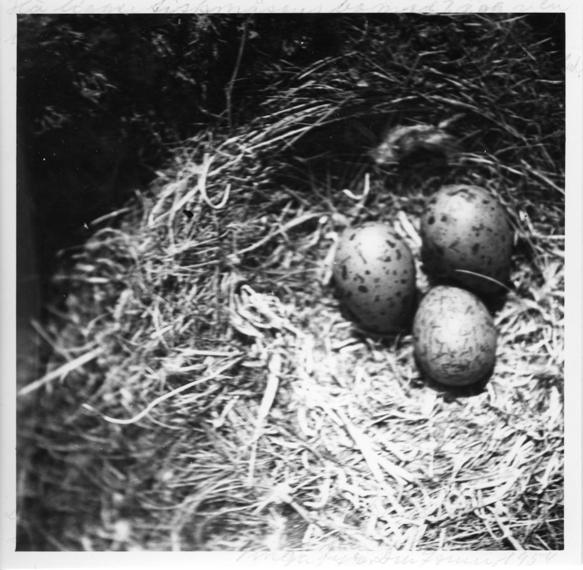 'Enligt anteckning på fotografiets baksida: :: ''Här ligger fiskmåsens bo med 3 ägg i en bergsklyfta på västra sidan av östra delen av Vinga. Bilden är tagen på 30 cm avstånd. Detta är den västligaste häckningsplatsen av denna fågel.'' :: :: Ingår i en serie med fotonr. 4512:1-57 med diverse foton av fågelbon med ägg och ungar. Varje fotografi har utförliga anteckningar på sin baksida, kopierade från framsidan, spår av de på framsidan är fortfarande synliga.'