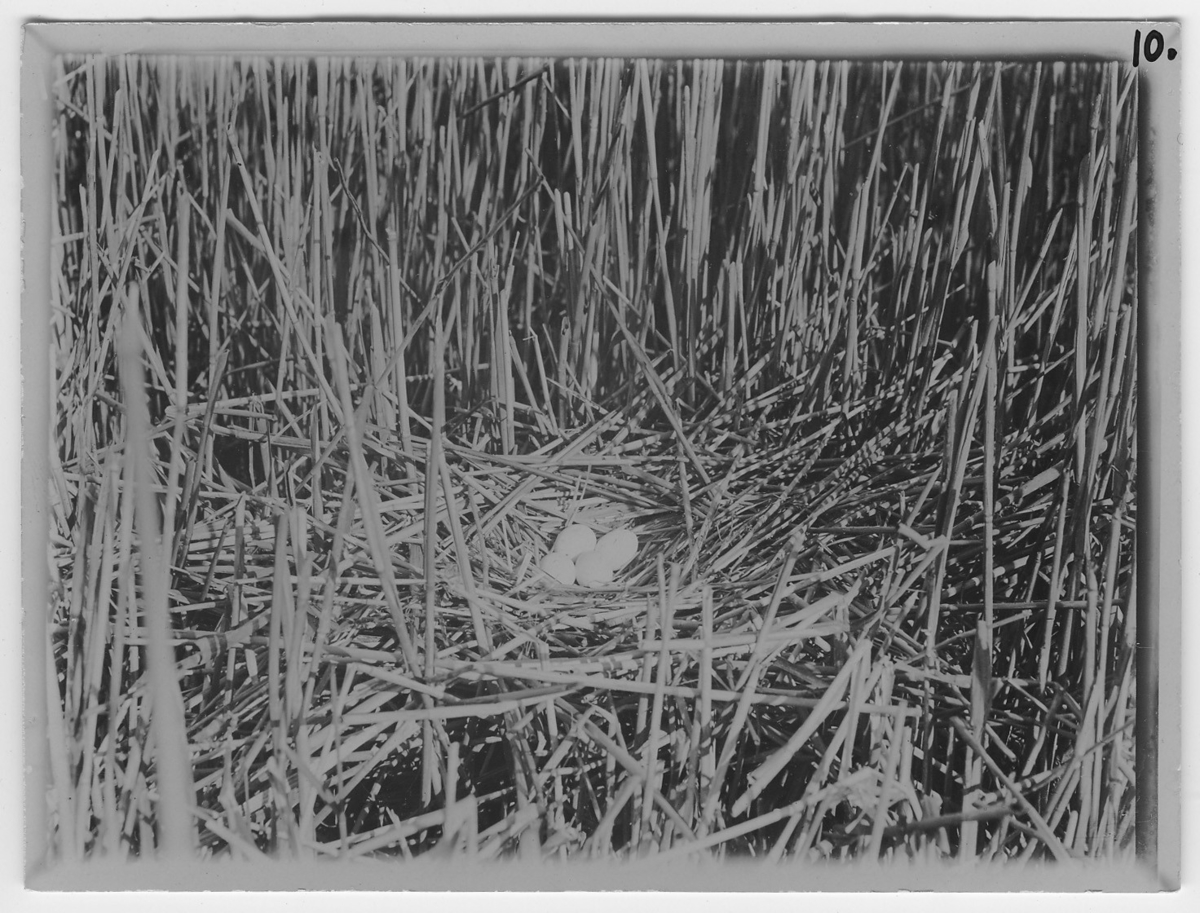 'Brun kärrhök, bo med 4 ägg, närbild, i vassvegetation. :: :: Ingår i serie med fotonr. 450-467.'