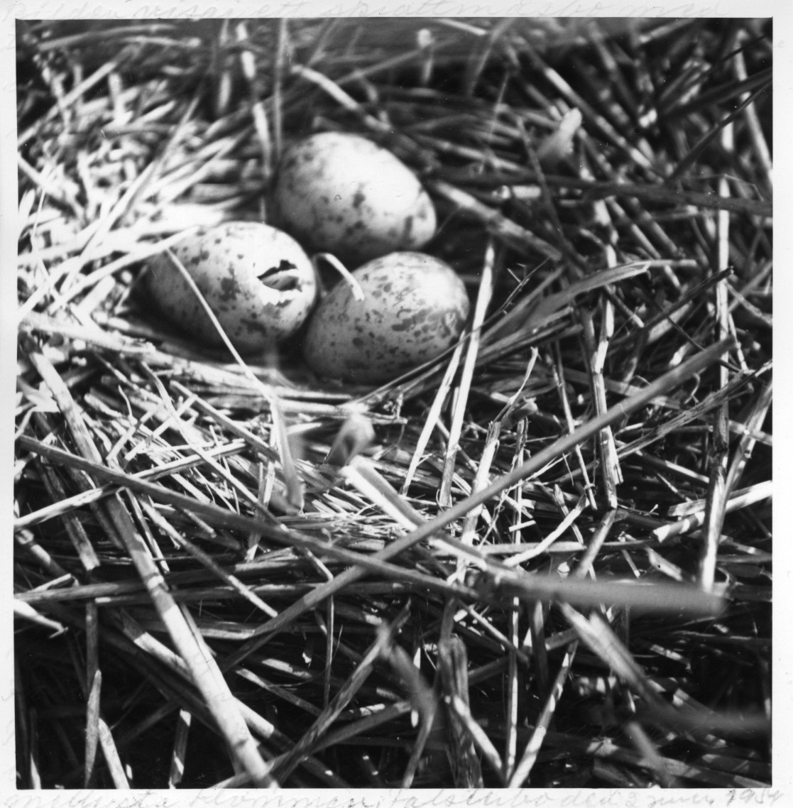'Enligt anteckning på fotografiets baksida: :: ''Bilden visar ett skrattmåsbo med tre ägg, av vilka det längst till vänster är kläckfärdigt och man ser ungens näbb i ägget. :: Vattnet synes nertill på bilden. Kolonien innehöll ett 50-tal par. :: Bilden togs på 33 cm avstånd. Reden bestod av vasspinnar och torrt gräs.'' :: :: Ingår i en serie med fotonr. 4512:1-57 med diverse foton av fågelbon med ägg och ungar. Varje fotografi har utförliga anteckningar på sin baksida, kopierade från framsidan, spår av de på framsidan är fortfarande synliga.'
