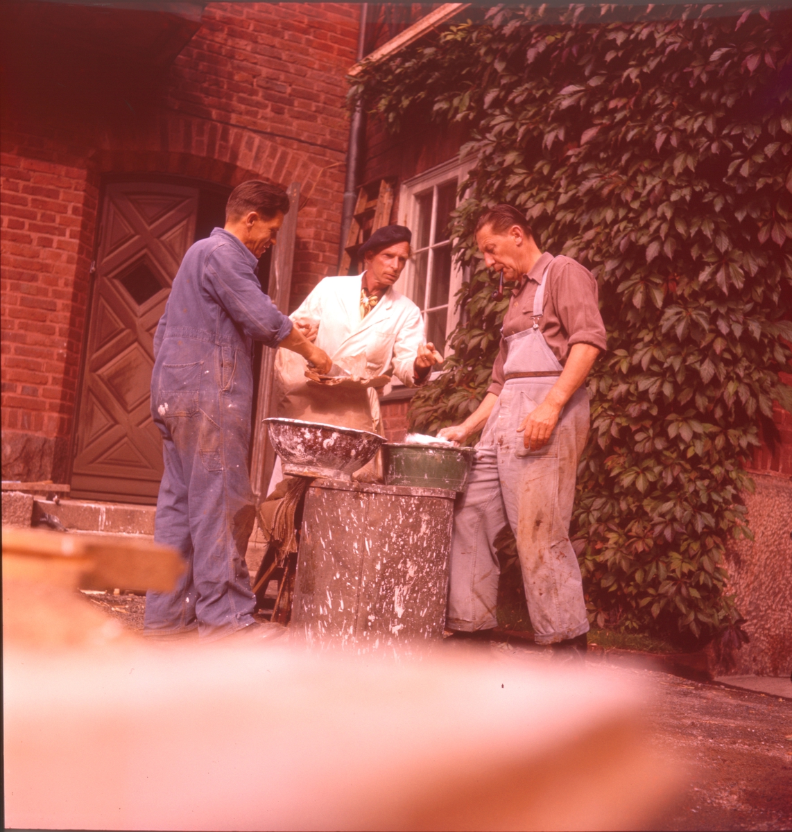 '2 näbbvalar, en gammal hona och en unge hittade, avgjutning gjord av ungen: :: :: 3 män stående på innergården under arbetet med avgjutningen av näbbvalen. Från vänster till höger: :: :: Ingår i serie med Fotonr. 4673:1-12.'