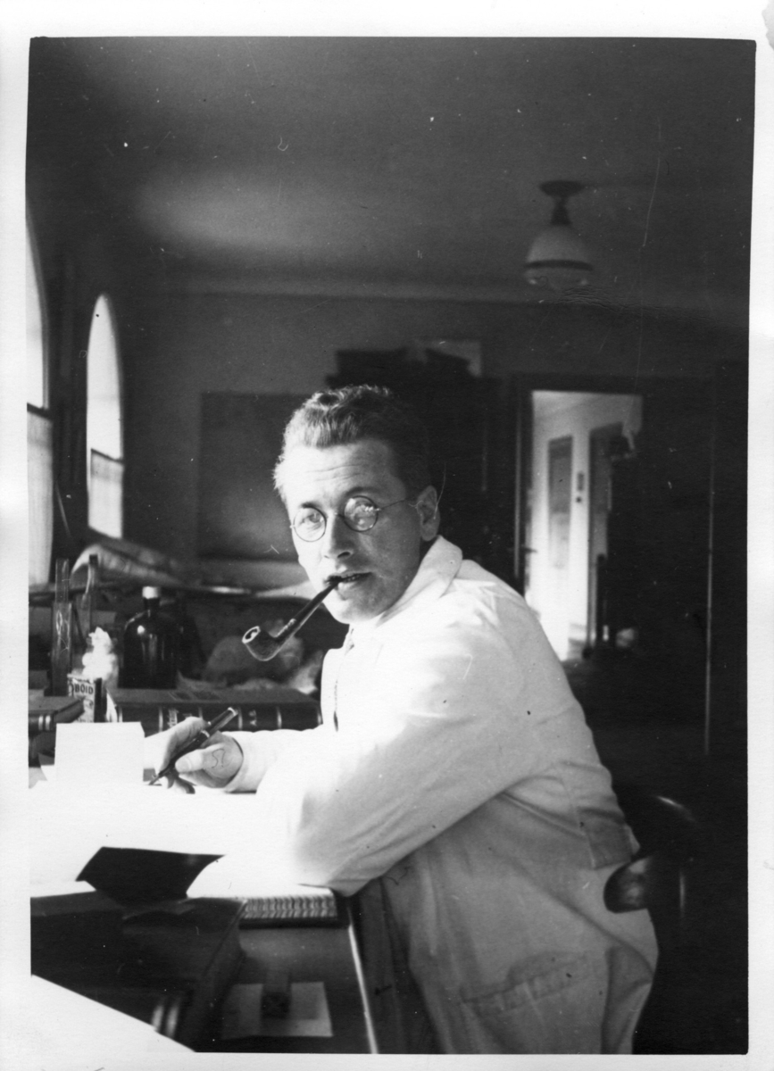 'Serie med 8 fotografier på Sune Swärd som varit verksam på Götebrogs Naturhistoriska Museum. :: :: Sune Swärd med pipa i sin mun, vid ett skrivbord. Utanför chefsrummet.'