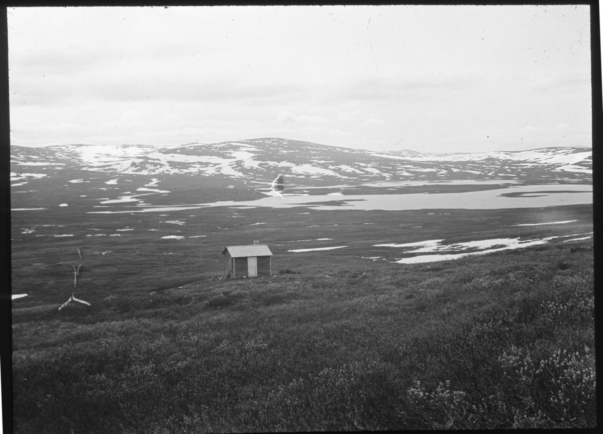'Bildtext: ''Tjålmejaure, sedd från Svaipas sydsluttning.'' Vy med fjällsjö med snöklädda fjäll i fonden. Intill sjön liten trälada. :: :: Ingår i serie med fotonr. 5155:1-10 numrerade med bildnr 101-109. Se även hela fotoserien med fotonr. 5155-5174.'