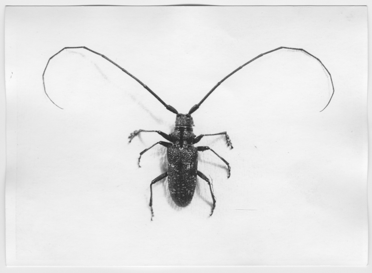 'Tallbock, helbild. Kroppens längd 19mm, bredden 5 mm och antennlängd 45 mm. Fynddatum: 1970-07-31. :: :: Se även fotonr. 5095:2.'