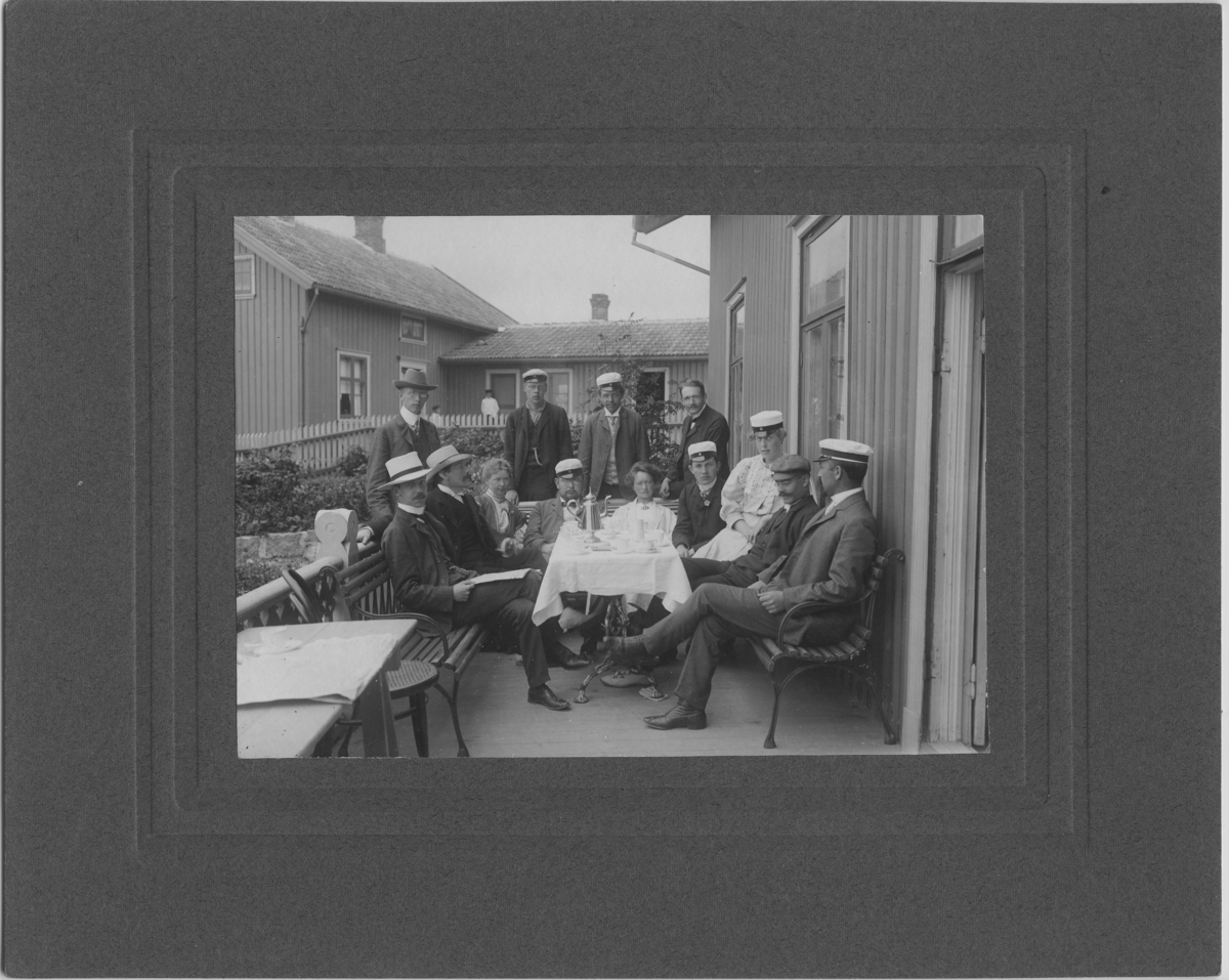 'Kristinebergs Zoologiska station. :: :: Gruppfoto vid kaffebord på en veranda, 3 kvinnor, 10 män. I bakgrunden är ytterligare hus synliga samt ytterligare 2 personer. Sittande på träbänkar. Iklädda hatt, studentmössa och skärmmössa. I bakgrunden syns ytterligare byggnader. :: :: Ingår i serie med fotonr. 5103:1-24.'