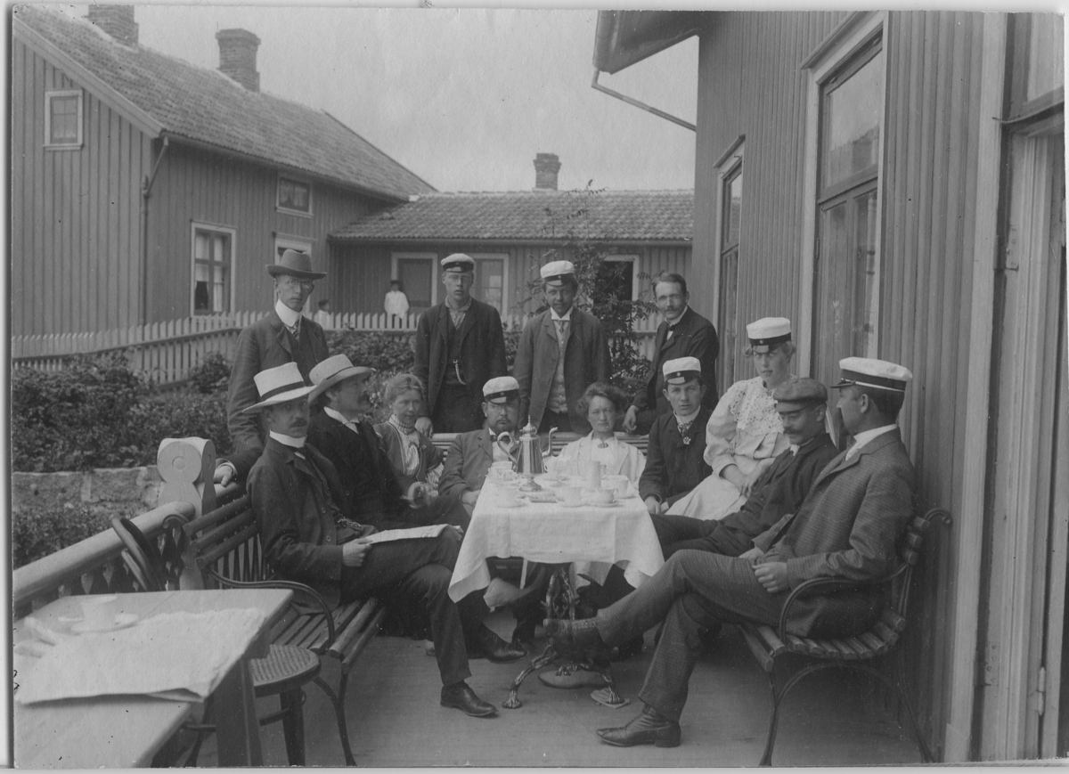 'Kristinebergs Zoologiska station. :: :: Gruppfoto vid kaffebord på en veranda, 3 kvinnor, 10 män. Sittande på träbänkar, iklädda hatt, skärmmössa, studentmössa.I bakgrunden är ytterligare hus synliga samt ytterligare 2 personer. :: :: Ingår i serie med fotonr. 5103:1-24.'