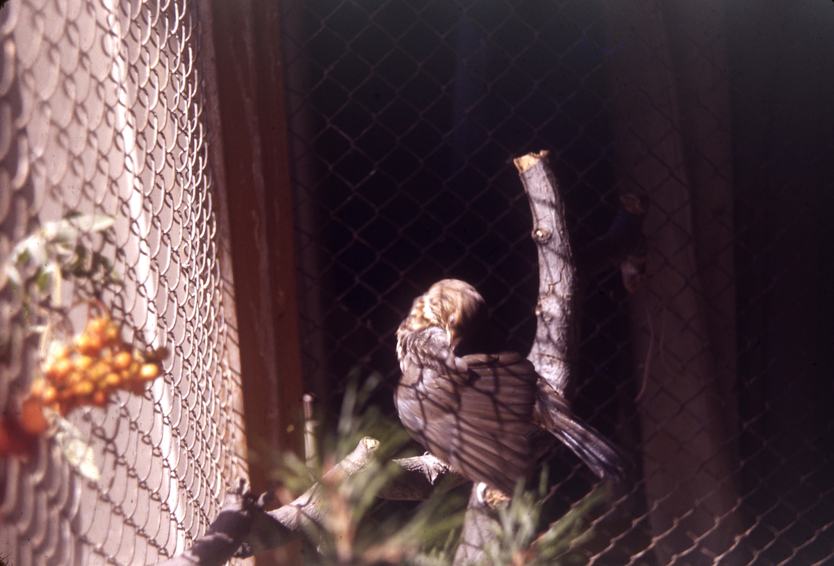 '2 bastarder mellan björktrast och koltrast, innanför nät i bur: :: Närbild på 1 av fåglarna, rönnbärsklase. :: :: Ingår i serie med fotonr. 4696:1-5. Se även fotonr 4652.'