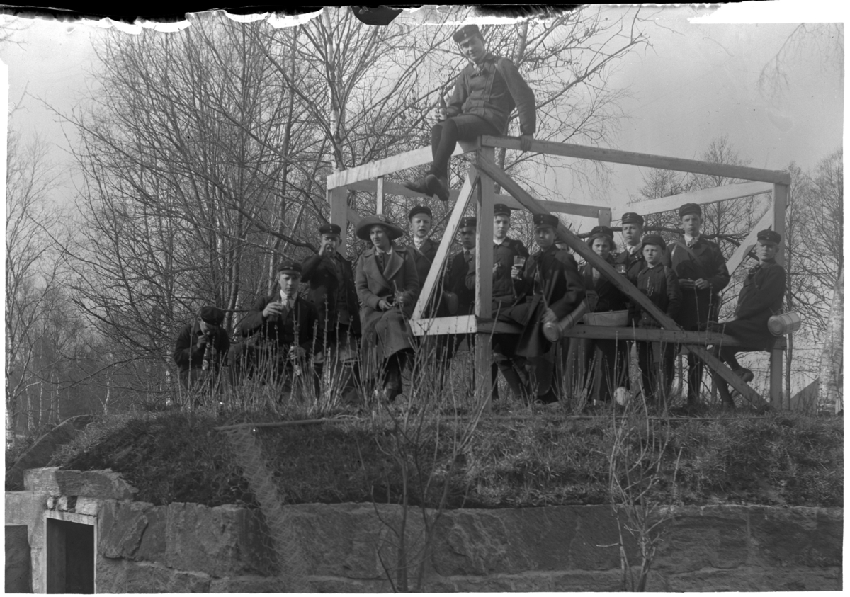 'Gruppbild, 12 pojkar (elever) och 2 kvinnor samlade vid träställning ovanpå byggnad av stenmur med öppning samt taket klätt med gräs (stenkällare?). Iklädda hattar, skärmmössor, kepsar, väskor. De håller glas och glasflaskor med etiketter. Mot väggen står lutad rulle med ståltrådsnät, grovmaskigt. :: :: Ingår i serie med fotonr. 5140:1-39.'