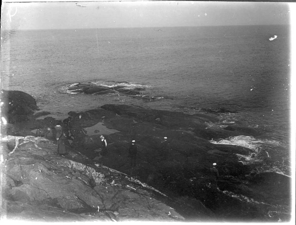 'Vy ut över havet. Människor, 2 kvinnor i hatt och 3 män i vita mössor, gående på berghäll ner mot havet. Plockande purpursnäcka. Se även fotonr. 5139:31, samma motiv. :: :: Ingår i serie med fotonr. 5137 med diverse bilder, en del ev. Kristineberg. Plåtarna ligger i 2 pappaskar. På asken för negativen 8x8 cm står texten: ''Kristineberg negativ samt negativ av havsdjur.'