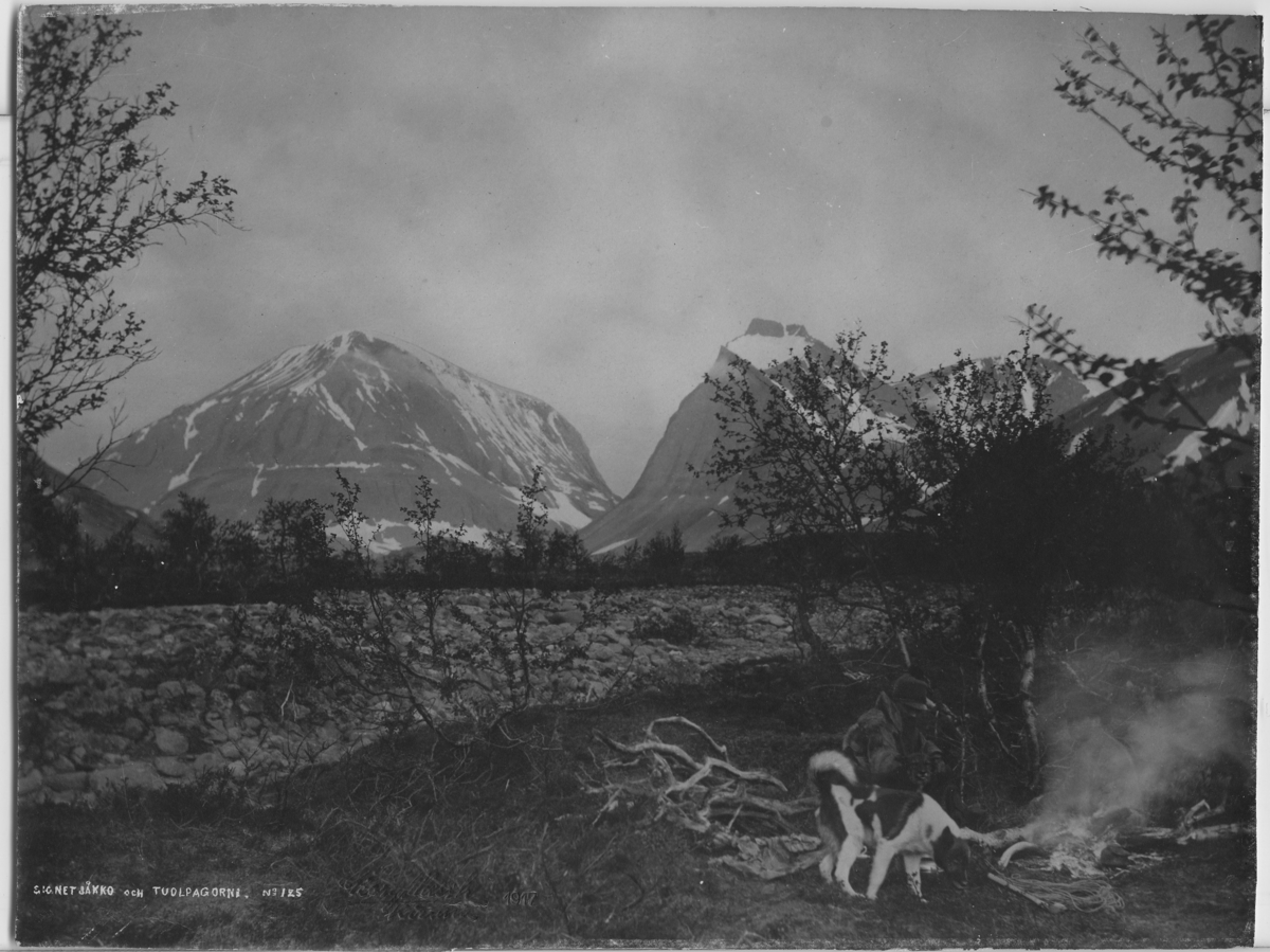 'Signetjåkko och Tuolpagorni i bakgrunden, i förgrunden en man med hund vid en eld. :: :: Ingår i serie med fotonr 4871-4879.'