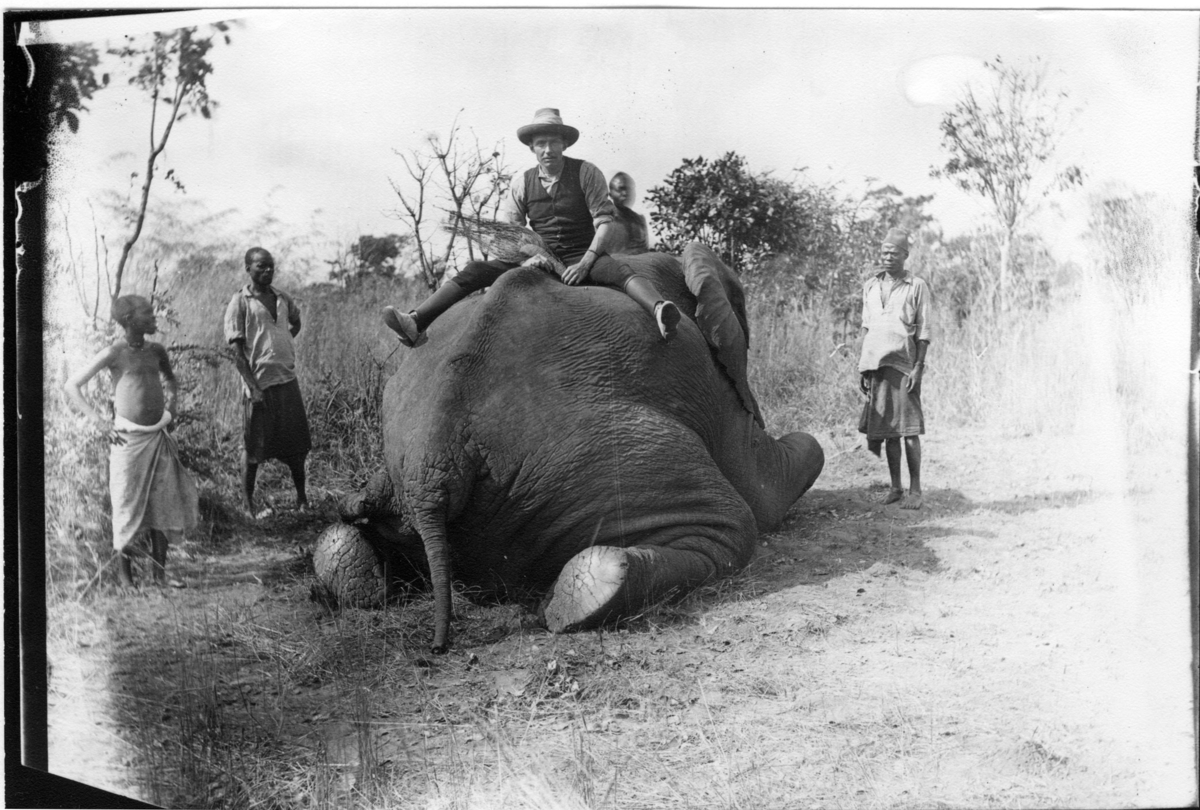 'Diverse fotografier från bl.a. dåvarande Nordrhodesia, nu Zambia, tagna av Konsul Magnus Leijer. :: :: 1 st man sittande på baken av en fälld elefant (med svansen i handen), fotograferad bakifrån. Bakom honom sitter 1 st man. Runt omkring står st män.'