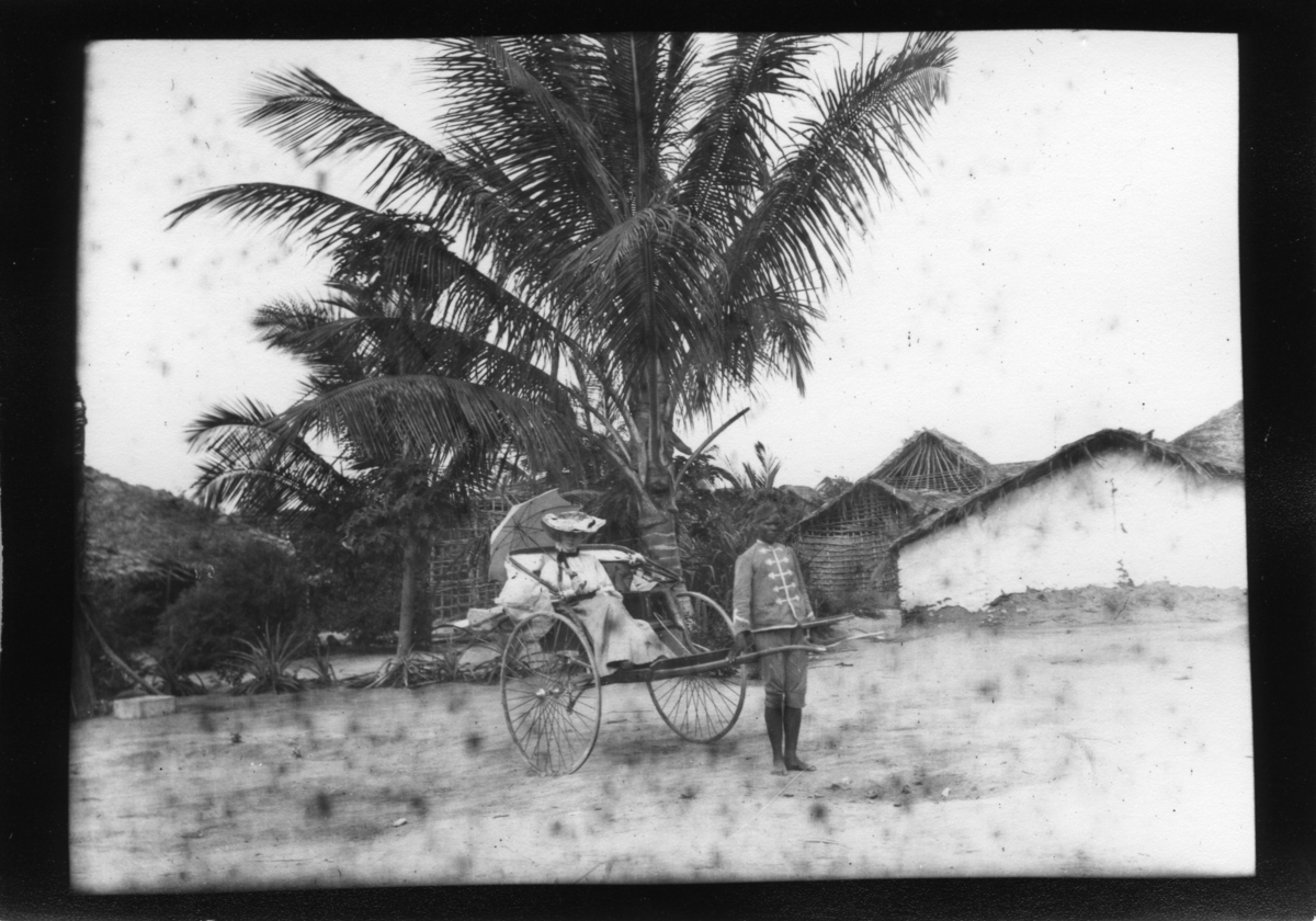 'Diverse fotografier från bl.a. dåvarande Nordrhodesia, nu Zambia, tagna av Konsul Magnus Leijer. :: :: 1 st kvinna med parasoll sittande i en vagn dragen av 1 st man. Bakom dem är byygnader och träd synliga.'