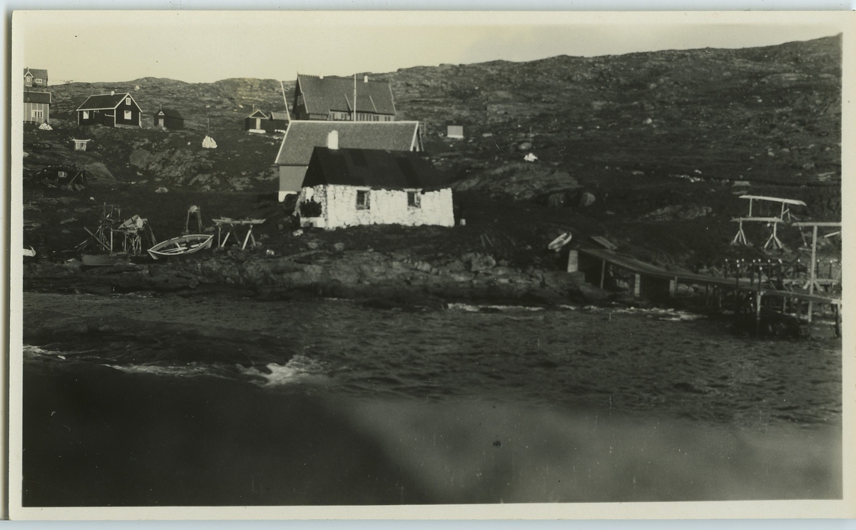 'Vy över kolhus, brygghus, 2 ''sjukhus'' samt Dr. Rasks hus. På bilden syns också en brygga och en uppdragen båt, Upernivik :: :: Enligt kuvertet som negativet låg i ''Trip to W-GreenlandI''. :: :: :: Ingår i serie Fotonr. 5217:1-103. Se även hela fotonr. 5202-5218 med bilder från Frits Johansen.'