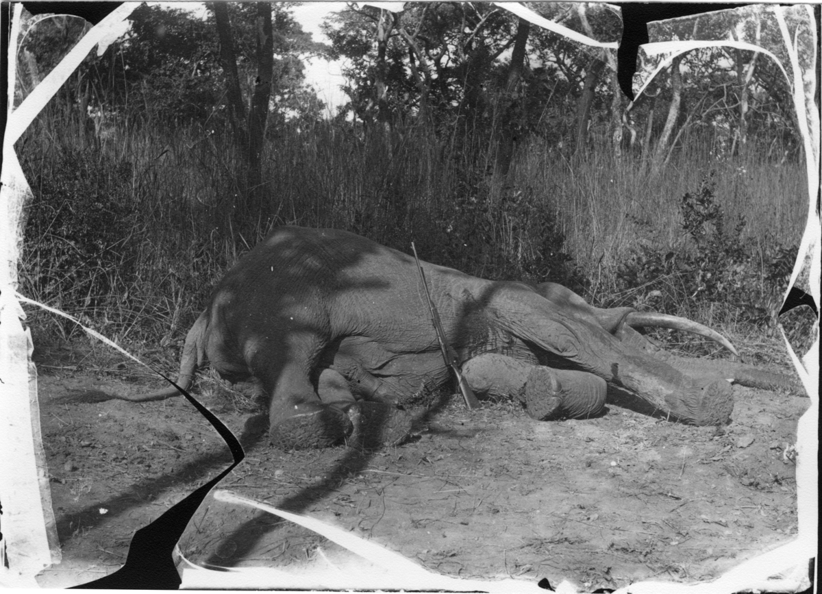 'Diverse fotografier från bl.a. dåvarande Nordrhodesia, nu Zambia, tagna av Konsul Magnus Leijer. :: :: En fälld elefant liggande på sidan, med ett gevär lutat mot magen. Fotograferad från magsidan. Bakom kroppen, hög växtlighet.'