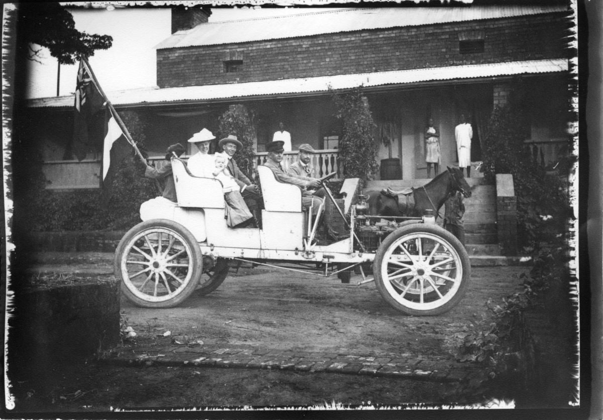 'Diverse fotografier från bl.a. dåvarande Nordrhodesia, nu Zambia, tagna av Konsul Magnus Leijer. :: :: 3 st män och 1 st kvinna med barn sittande i en bil, bakpå bilen sitter 1 st man med 2 fanor i händerna. Bakom bilen, en häst, hus och 3 st människor.'