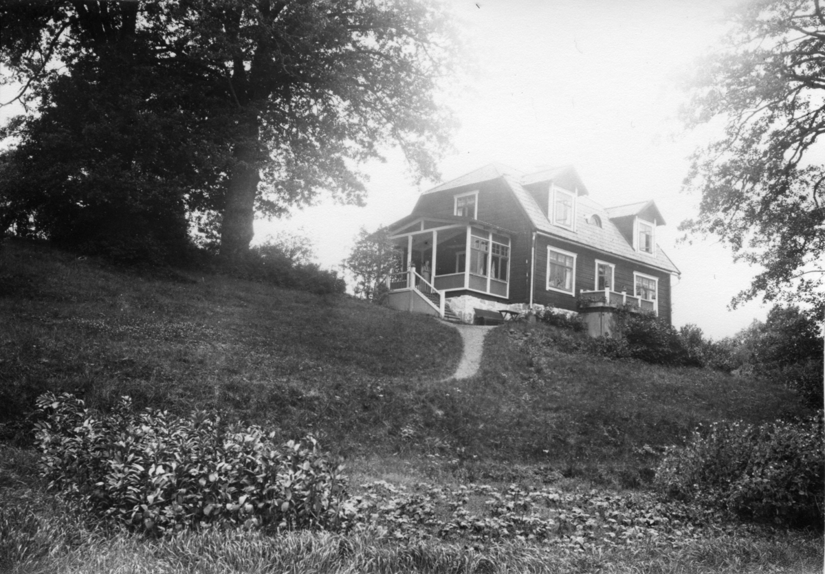 'Diverse fotografier från bl.a. dåvarande Nordrhodesia, nu Zambia, tagna av Konsul Magnus Leijer. :: :: En träbyggnad fotograferad nere från basen av en kulle, buskar, träd och gräs i förgrunden. På trappan till byggnaden står en kvinna.'