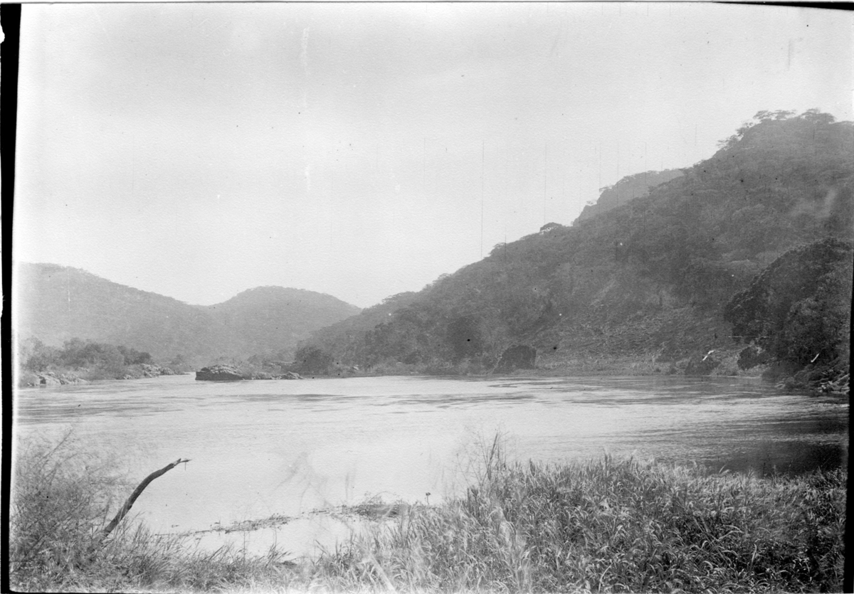 'Diverse fotografier från bl.a. dåvarande Nordrhodesia, nu Zambia, tagna av Konsul Magnus Leijer. :: :: Vy över trädbevuxna sluttningar ner mot en flod, i förgrunden lägre växter.'