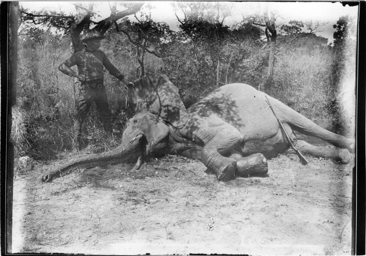 'Diverse fotografier från bl.a. dåvarande Nordrhodesia, nu Zambia, tagna av Konsul Magnus Leijer. :: :: En fälld elefantunge liggande på marken, mot kroppen står ett gevär lutat. En man står vid elefantens huduv och håller i dess huvud.'