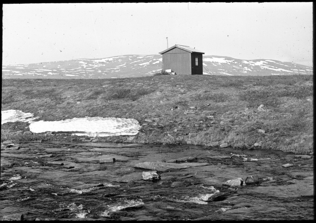 'Bildtext: ''Stuga mellan Svaipa och Tjålmejaure.'' Vy med vattendrag i förgrunden med berghällar alternativt stenblock. Trästuga strax ovanför vattendraget och i fonden snöklädda fjäll. :: :: Ingår i serie med fotonr. 5163:1-7 numrerade med bildnr 201-207.'
