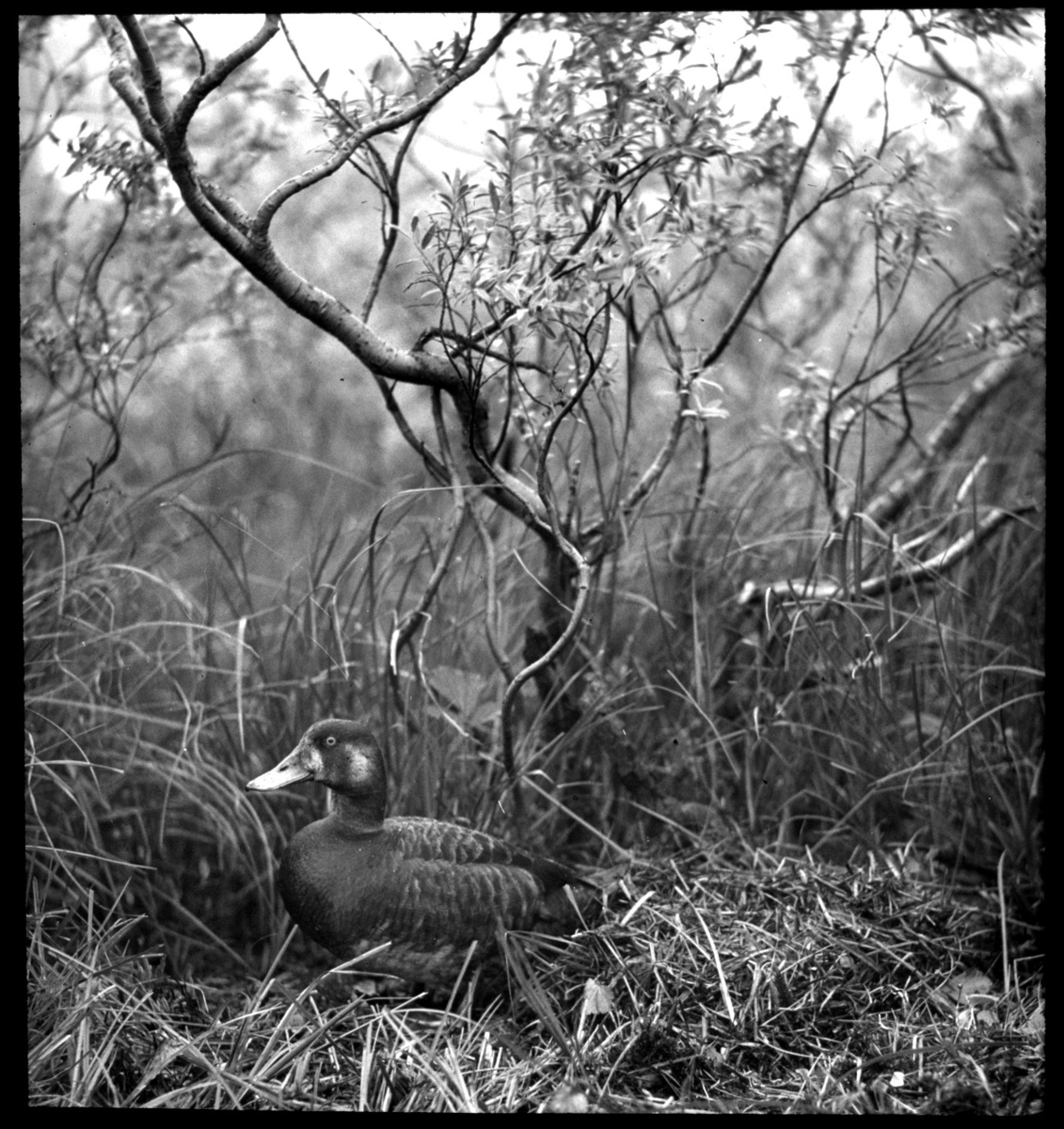 'Bildtext: ''Bergand, stående vid boet.'' Bergand, i hög gräsvegetation framför buske. :: :: Ingår i serie med fotonr. 5161:1-9, se även hela serien fotonr. 5155-5162.'