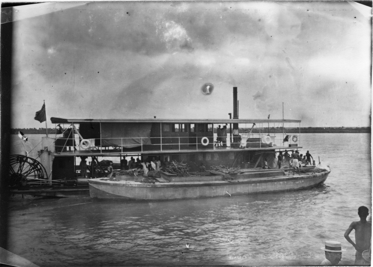 'Diverse fotografier från bl.a. dåvarande Nordrhodesia, nu Zambia, tagna av Konsul Magnus Leijer. :: :: 1 hjulfartyg med människor, vid sidan av det ligger en avlång smal båt. I förgrunden är 2 personer synliga.'