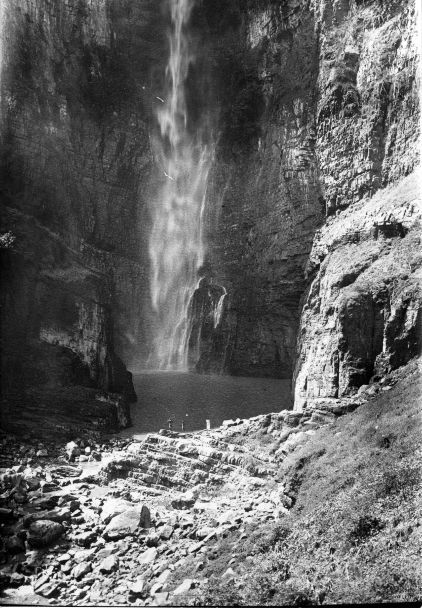 'Diverse fotografier från bl.a. dåvarande Nordrhodesia, nu Zambia, tagna av Konsul Magnus Leijer. :: :: Vy över vattenfall med klippor i förgrunden, Vid vattnet står tre människor fotograferade från avstånd.'