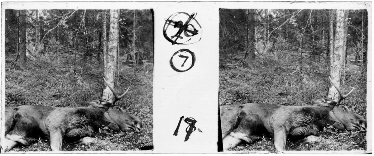 'Bildtext: ''Peter Möllers älgtjur.'' :: 1 älgtjur liggande på marken (skjuten?). :: :: Ingår i serie med fotonr. 5253:1-18, se även hela serien med fotonr. 5237-5267.'