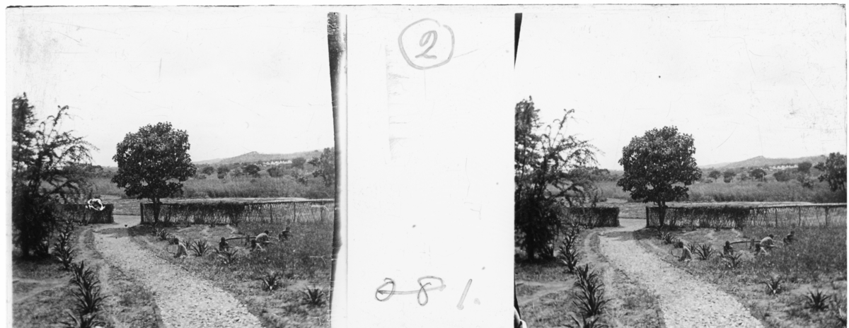 'Vy inifrån hustomt med grusgång och odling. 5 personer sitter på huk och jobbar i odlingen, staket i bakgrunden. Vy ut mot halvöppet landskap med höjder på avstånd. :: Enligt text till fotot: ''View from A.N.C:s house''. (utsikt från A.N.C.:s hus). :: :: Ingår i en serie med fotonr. 5237:1-16. Se även fotonr. 5238:1-18, 5239:1-18 och 5240:1-17, 5241:1-18.'