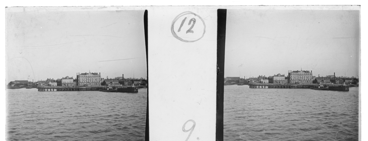 'Vy in mot Harwich med hamn, båt och byggnader. :: Enligt text till fotot: ''North Sea voyage. Harwich, from streamer.'' (Nordsjöseglats. Harwich sett från ångbåten.) :: :: Ingår i serie med fotonr. 5245:1-20, se även hela serien med fotonr. 5237-5267.'