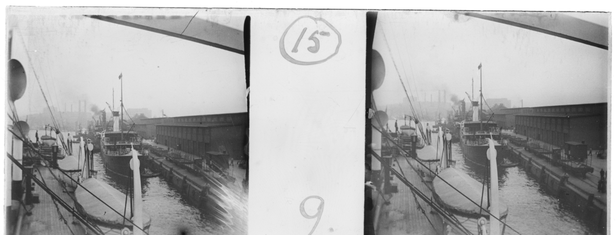 'Båtar i Göteborgs hamn. På land tågvagnar. Människor på båtdäck. :: Enligt text till fotot: ''North Sea voyage. Saga arriving Göteborg.'' (Nordsjöseglats. Saga anländer till Göteborg.) :: :: Ingår i serie med fotonr. 5245:1-20, se även hela serien med fotonr. 5237-5267.'