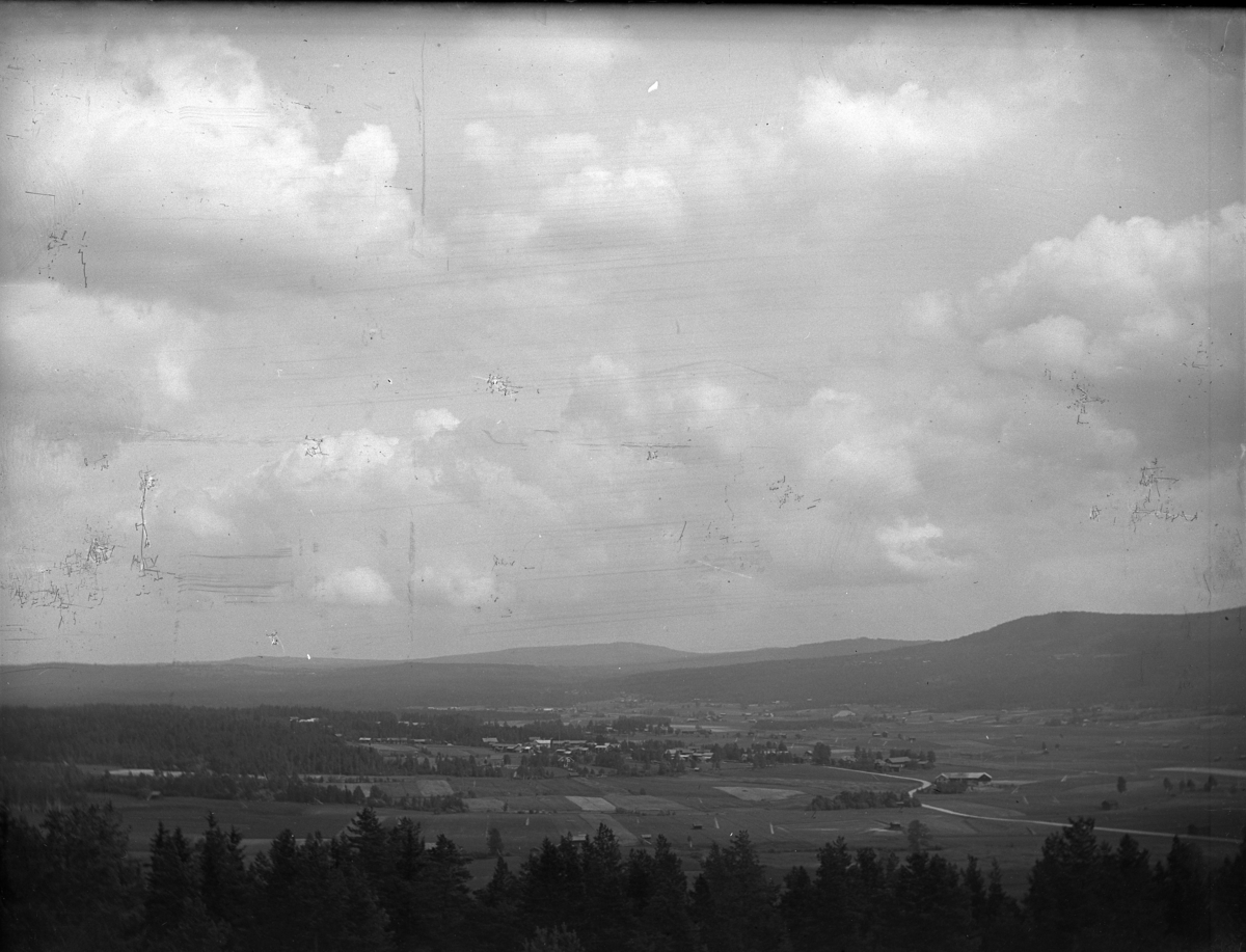 'Bildtext: ''Från Tibble.'' :: Vy över samhälle med hus, väg och öppna fält, åkrar. Skog omkring. :: :: Ingår i serie med fotonr. 5231:1-11. Se även fotonr. 5223:1-13, 5232:1-8 och 5234:1-12.'