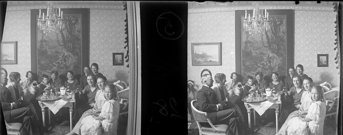 'Bildtext: ''von Schultz och Löfmarcks.'' :: Grupp samlade kring dukat bord, kvinnor, barn, flickor och män stående och sittande. Interiör med takkrona, tavlor, tapet. På bordet duk, kaffekanna, glas, glasflaskor och kaffekoppar. Klädsel. 1 kvinna har en hund i knäet. Möbler. Kläder. :: :: Ingår i serie med fotonr. 5264:1-16. Se även hela serien med fotonr. 5237-5267.'