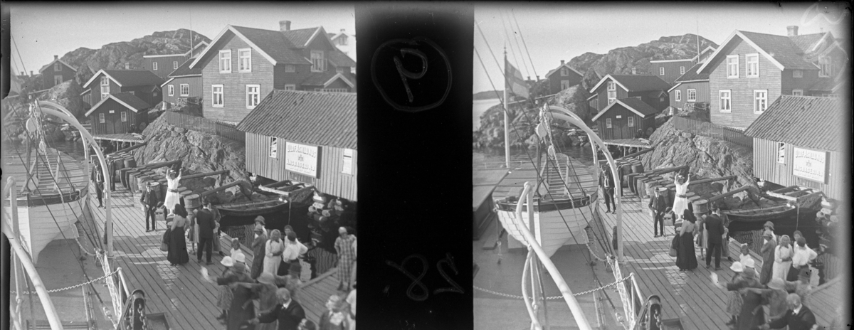 'Bildtext: ''Kyrkesund, båtbryggan.'' :: Grupp människor, män, kvinnor, barn samlade på båtbryggan. Invid en båt i färd med att sättas ned alternativt tas upp. I bakgrunden byggnad med texten ''Olof Asklunds ångbageri AB''. På bryggan trätunnor och i vattnet eka. Kläder. :: :: Ingår i serie med fotonr. 5264:1-16. Se även hela serien med fotonr. 5237-5267.'
