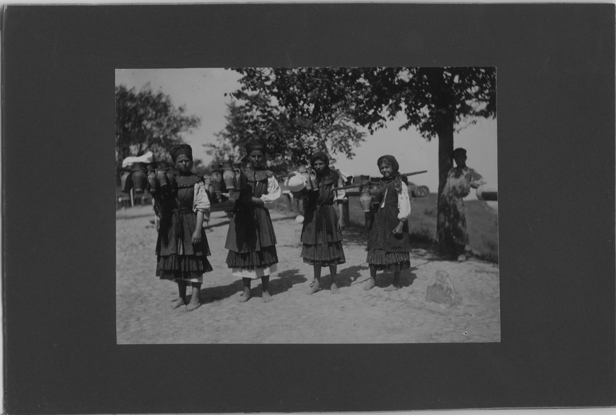 4 flickor stående på en kullerstensväg. De har små krus hängande på en stav över axeln. Kläder. Klädsel.