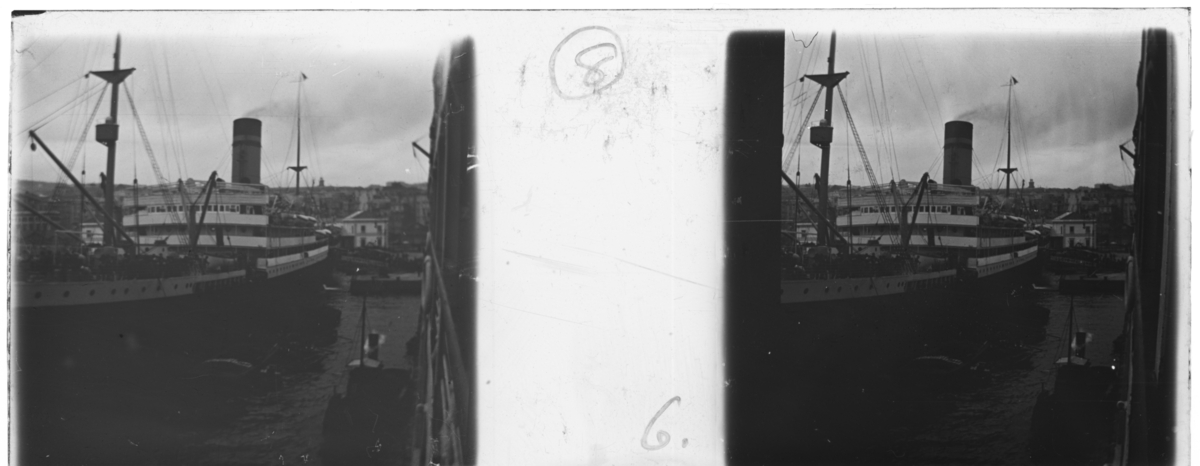 'Vy med ångbåt liggande invid kaj. I bakgrunden hus. :: Enligt text till fotot: ''Quay, and emigrant steamer Marseilles.'' (Kaj, och utvandrarångbåten Marseille.) :: :: Ingår i serie med fotonr. 5242:1-17, se även hela serien med fotonr. 5237-5267.'