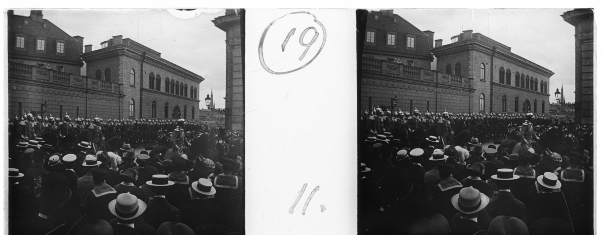 'Vaktavlösning med militärer uppställda nedanför stenmur nedanför slottet. Även beridna vakter. Åskådare i förgrunden. Flera bland åskådarna med ''sjömansklädsel''? :: Enligt text till fotot: ''Changing guard at the palace. Hästgardet marches off.'' (Vaktavlösning vid slottet. Hästgardet marscherar iväg.) :: :: Ingår i serie med fotonr. 5247:1-20, se även hela serien med fotonr. 5237-5267.'