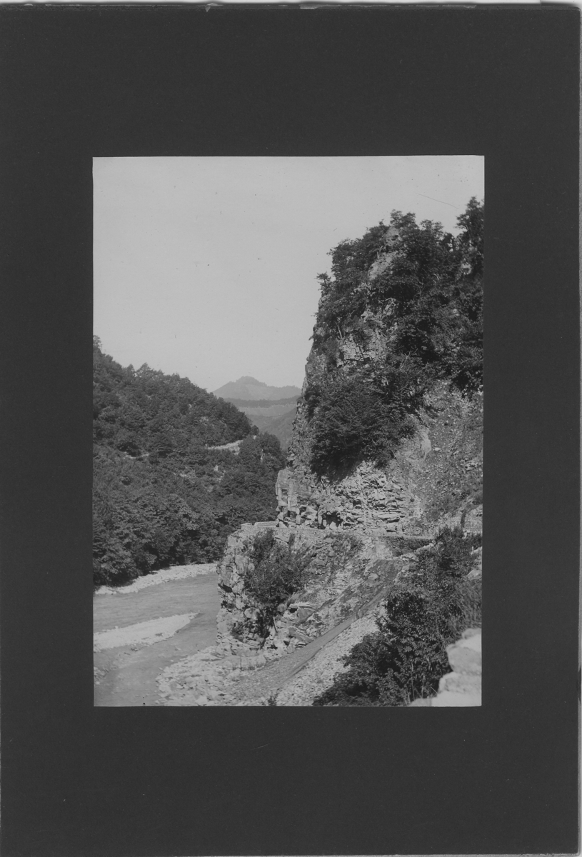 'Vy med bergvägg med slingrande väg intill berget, med mur längs ytterkanten. Vy med berg i fonden och trädklädda berg. :: :: Ingår i serie med fotonr. 5288:1-30. Se även fotonr. 5269-5292 med bilder från Stuxbergs resa till Kaukasien.'