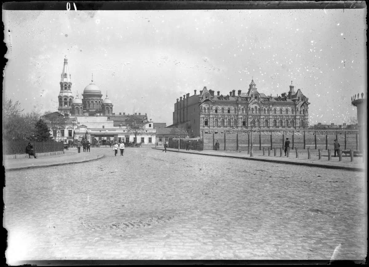 'Gatuvy med människor gående på kullerstensyta. 2 uniformsklädda, ev poliser, med batonger. Längs gatan hästar och vagnar, ekipage, droskor. Stor byggnad till höger samt katedral till vänster. Gatlampa. Gatlykta. Kläder. Klädsel. :: :: Ingår i serie med fotonr. 5286:1-18. Se även fotonr. 5269-5292 med bilder från Stuxbergs resa till Kaukasien.'