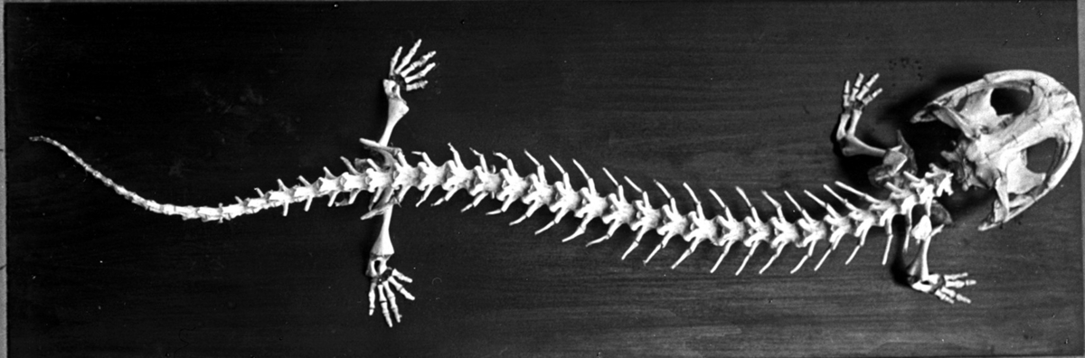 'Monterat skelett av salamander, sett från ryggsidan. :: :: Från Dr. Schlüter & Mass, Halle a S naturvetens. Läromedel. Numrerad I.C. Nr. 9. :: :: Ingår i serie med fotonr. 5374:1-30. Se även hela fotoserien 5374-5376.'