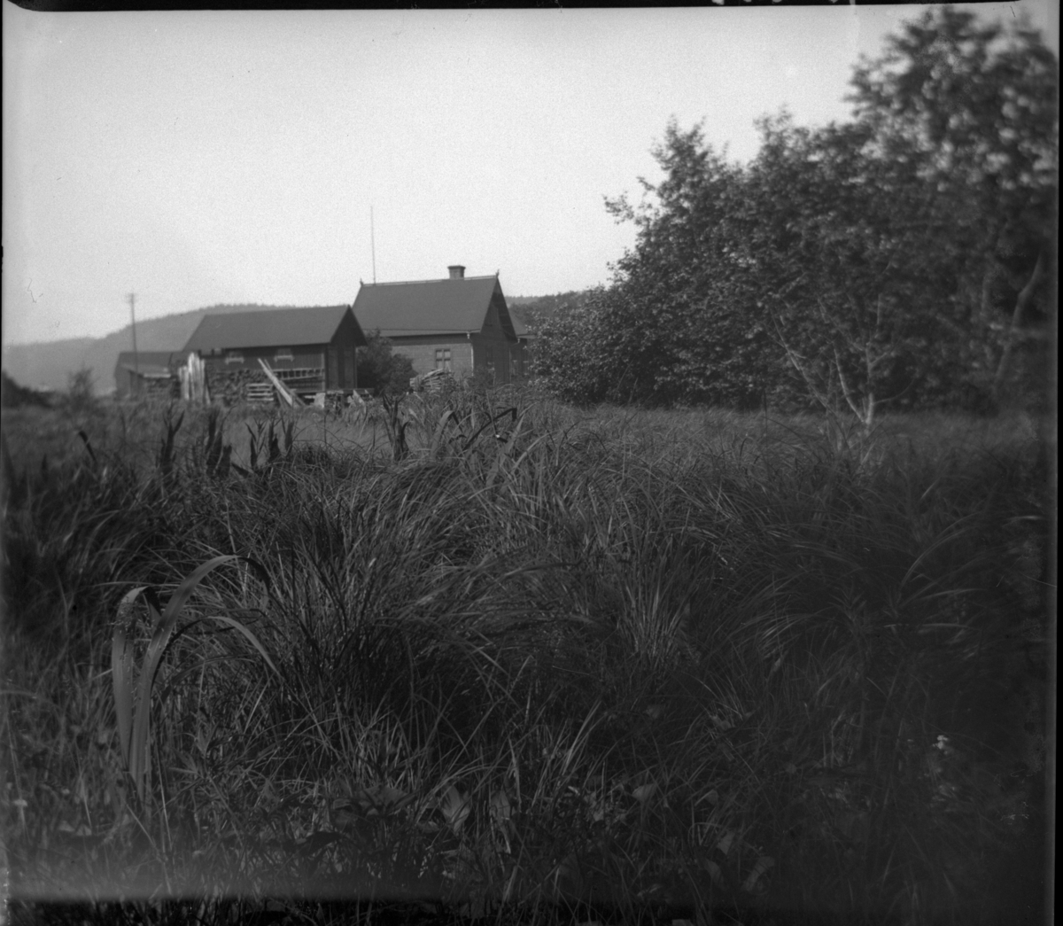 'Vy med hus på avstånd, i förgrunden kärr. :: :: Plåten låg i pappask tillsammans med 2 olika kuvert med texterna: ''Katrineholm samskola.'' resp. ''Från Stratiotes-kärret, Rosendala. 5 plåtar. Den 11 juli 1906.'' Är troligtvis den senare texten som passar in på plåten. :: :: Ingår i serie med fotonr. 5416:1-15.'