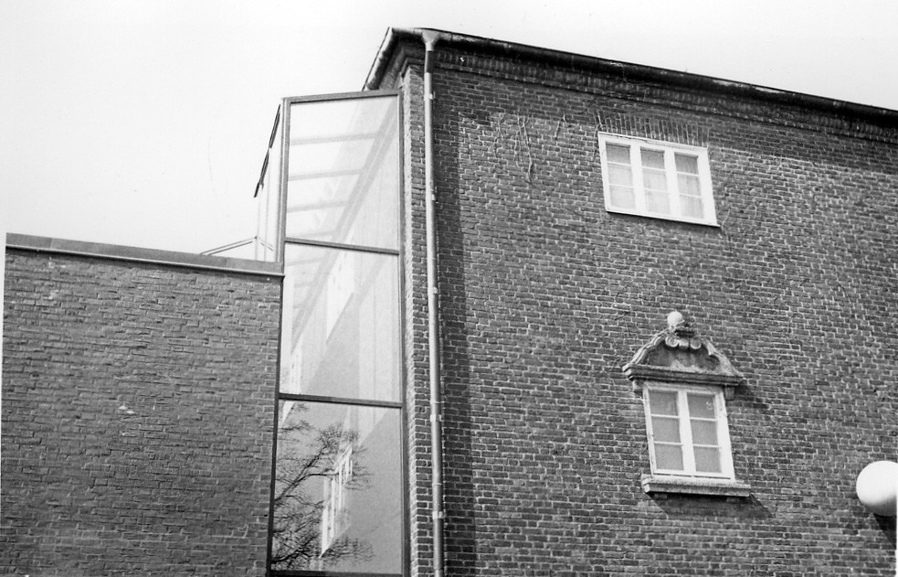 'Tillbyggnaden Göteborgs Naturhistoriska Museum 15 april 1980. Östra ytterväggen Göteborgs Naturhistoriska Museum, detalj av glasväggen mellan gamla byggnaden och tillbyggnaden. :: :: Ingår i serie med fotonr. 5527:69-216.'