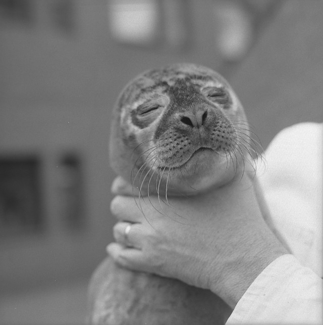 'Sven Mathiasson med säl i famnen. :: :: Närbild på sälen'