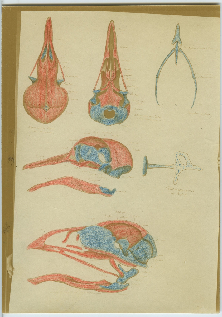 'Teckning av kranium hos duva ovanifrån, underifrån samt från sidan. Latinska namn utsatt på delarna, men lite svag färg på text. Exemplaret färglagt. :: :: ''Fotografier använda vid dissektionskursen våren 1928'' . :: Avfotograferade teckningar på skelett och organ. :: På baksidan av vissa står det Kerstin Nyblén :: V.T.-18 :: , ur bok'