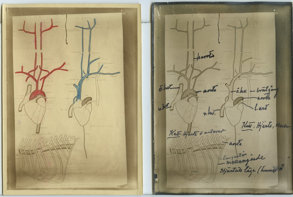 'Teckning av hjärtats läge hos hund och av hjärta och artärer samt av hjärta och vener hos katt. Latinska namn på organens delar utsatta. Anteckningar i bläck på ett exemplar. Det andra exemplaret färglagt. :: :: ''Fotografier använda vid dissektionskursen våren 1928'' . :: Avfotograferade teckningar på skelett och organ. :: På baksidan av vissa står det Kerstin Nyblén :: V.T.-18 :: , ur bok'