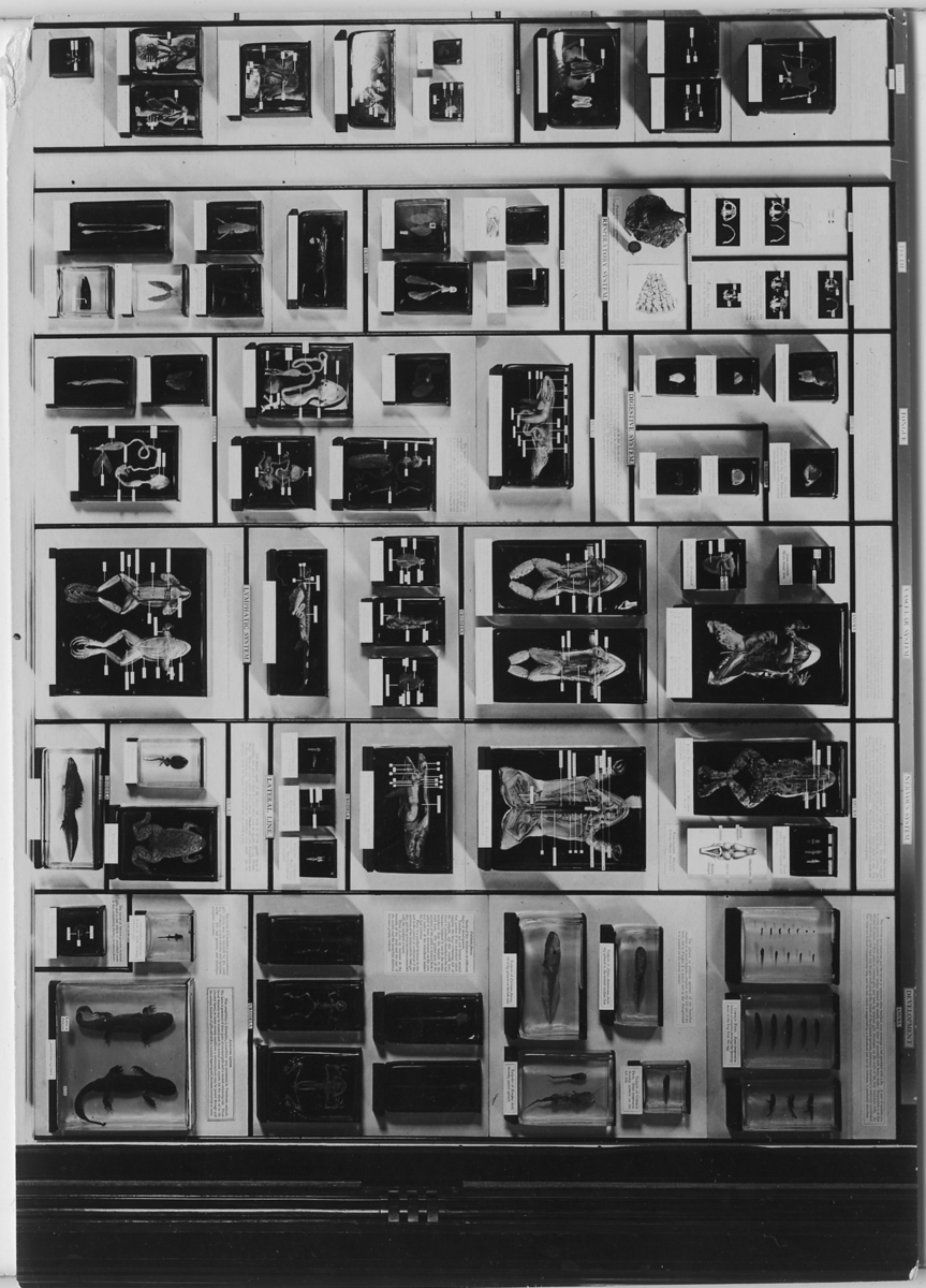 'Div. bilder på ''museala arrangemang av fåglar'', bilderna är insamlade av Leonard Axel Jägerskiöld. :: :: Utställda amfibier. Skelett, kroppsdelar, hela kroppar etc. Enligt anteckning på baksidan av fotografiet: ''amphibians, wall case in one of the bays of the bay.'''