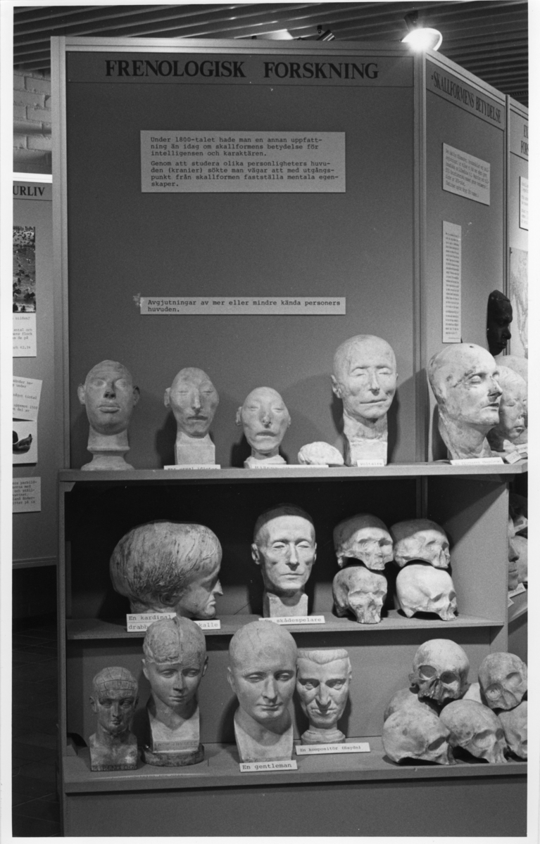 'Foto på Jubileumsutställningen, Göteborgs Naturhistoriska museum 150 år. :: :: Vy över utställningsskärmar med hyllor angående frenologisk forskning. På hyllor - avgjutningar av kända och okända personers huvuden: översta hyllan: 72,74,73,70,90,77, mellanhyllan: 69,114,16,12,11,197 nedre hyllan: 61,59,63,131,(u.nr.),34,99,24,19,25,32,195,2.'