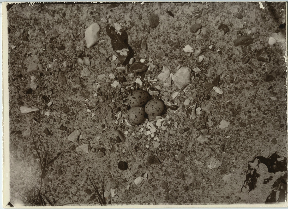 Småtärna, bo med 3 ägg i sanden med småstenar omkring. Närbild.